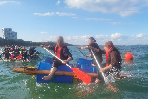 Freuen Sie sich auf eine Herausforderung für Ihr Firmen-Event an der Ostsee: Teamarbeit ist gefordert, um auf große Fahrt zu gehen! Seien Sie Planer oder Entwickler in Ihrem Team. Konstruieren und bauen Sie gemeinsam ein Floss aus Holzteilen, Seilelementen und Schwimmkörpern. Anschließend wird das Floss zu Wasser gelassen und die Schwimmfähigkeit in einem „Rennen“ erprobt.